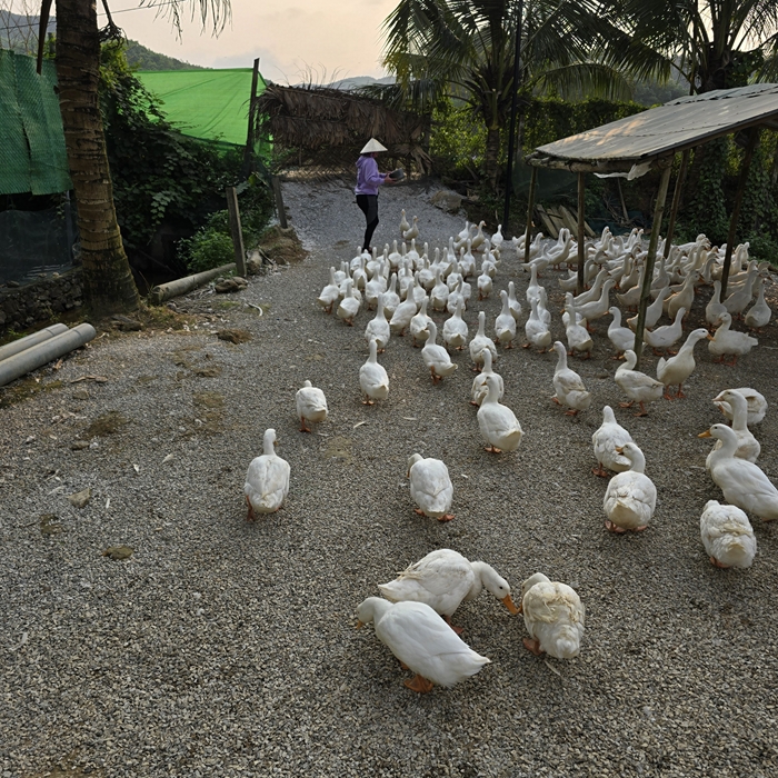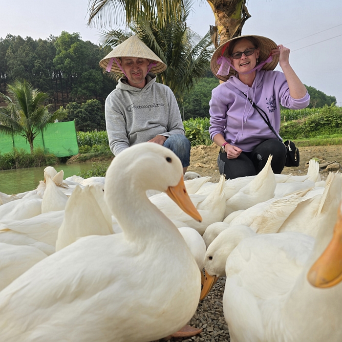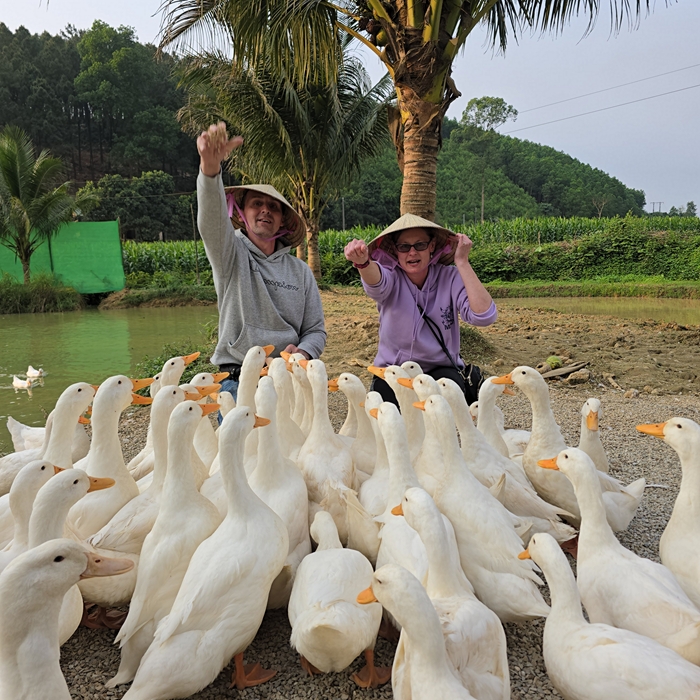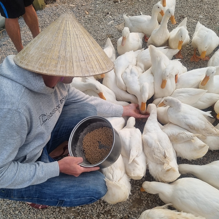Miejsce, którego nie można pominąć. Szczerze powiedziawszy, myśleliśmy, że będziemy oglądać kaczki, ale na miejscu czekała nas bardzo ciekawa przygoda. Po przyjeździe przedstawiono nam tabliczki w języku angielskim z opisem, co tak właściwie się tam dzieje. Takiej atrakcji się nie spodziewaliśmy, wraz dwoma dziewczynami z UK, zostaliśmy poproszeni o zmianę obuwia na plastikowe sandałki i o założenie kapeluszów, po czym cała czwórką poszliśmy karmić kaczki, zabawa była przednia, ale nie polecam, jeśli ktoś ma bardzo duże łaskotki na stopach, naprawdę można się popłakać ze śmiechu. Po ok. 20 minutowej zabawie z kaczkami(karmienie, nawoływanie, zdjęcia), wróciliśmy na plac, gdzie umyliśmy nogi i ręce, usiedliśmy przy stole, by w oczekiwaniu na poczęstunek napić się coca-coli lub piwa(wg własnego wyboru). Mieliśmy okazję spróbować wietnamskich naleśników w wersji mięsnej(wieprzowina) lub wegańskiej, były przepyszne.
