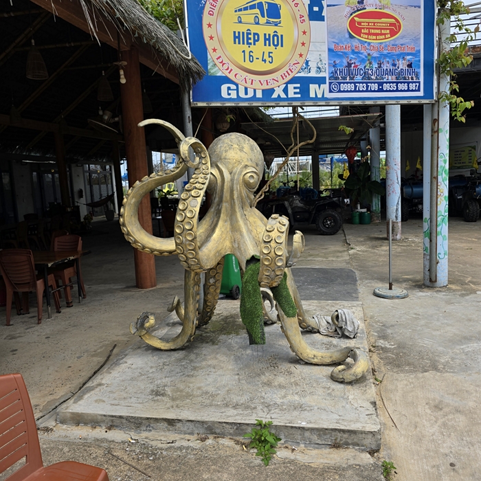 Miejscowość, w której obecnie mieszkamy jest duża, bardzo ładna, ale zupełnie nie turystyczna, przechadzając się ulicami Dong Hoi, wszyscy na nas patrzą, dzieciaki zaczepiają wołając „hello”, dla mieszkańców tego miasteczka i okolicznych wiosek jesteśmy atrakcją turystyczną. W tym mieście znajduje się kilka zabytków, ale nas bardziej interesowały okoliczne wioski. Przechadzając się uliczkami na wioskach, mogliśmy zobaczyć, jak naprawdę wygląda prawdziwy Wietnam. Tu ludzie żyją spokojniej, powoli, uśmiechnięci i widać było na ich twarzach zdziwienie, gdy nas mijali. Niektórzy jadący samochodem zatrzymywali się i pytali, czy nas gdzieś podwieźć, myślę, że pomyśleli, że się zgubiliśmy, a my po prostu poszliśmy na bardzo długi spacer. W tej miejscowości znajduje się lotnisko krajowe, więc mogliśmy podziwiać samoloty.